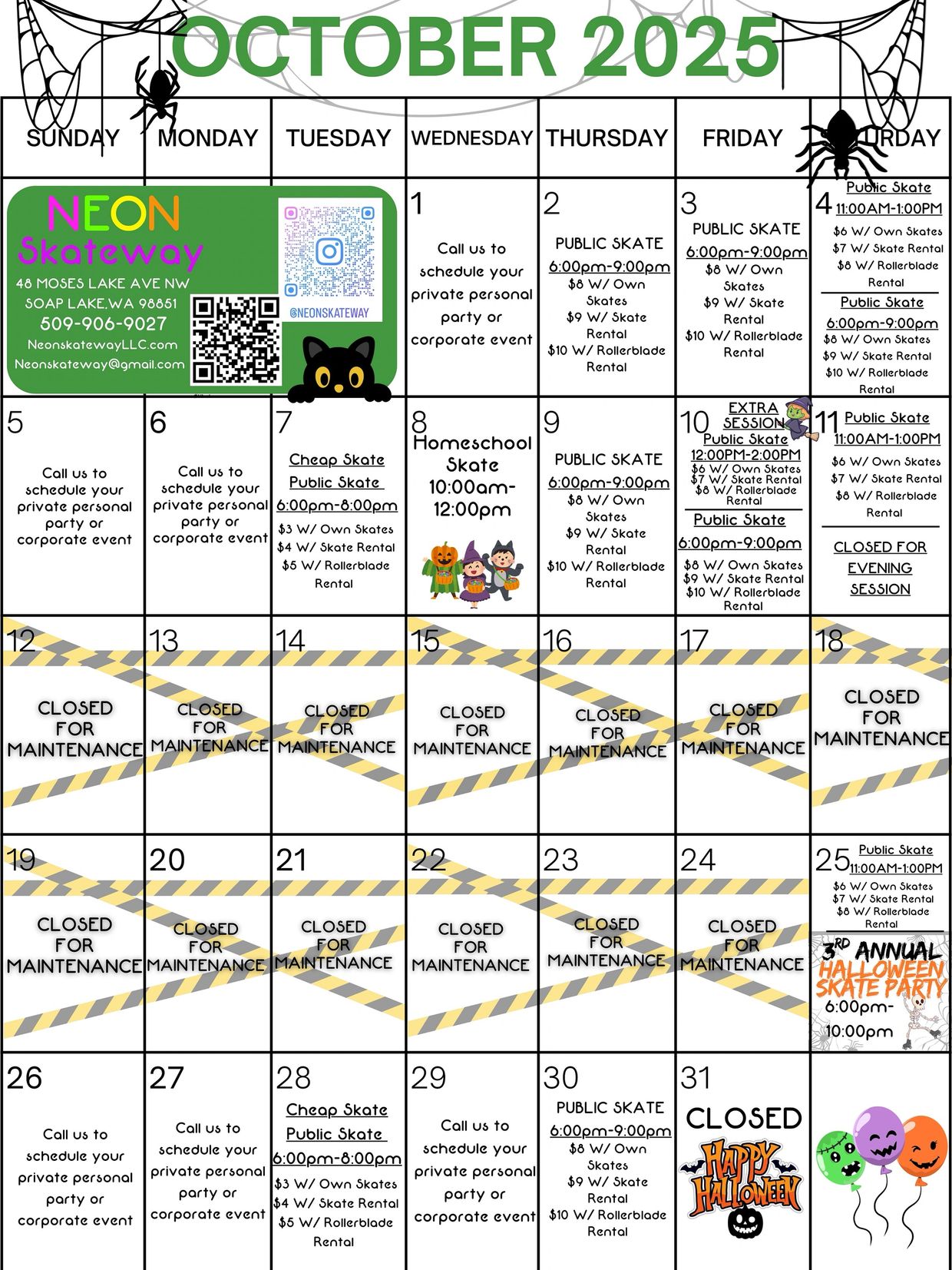 Neon Skateway is a skate at your own risk facility. While visiting and skating all persons assume any and all risks associated with the facility and its property. Neon Skateway is not responsible and is to be held harmless of any injury sustained while at its facilities. We encourage those who are prone to injury, have been injured before, or those who are or may be pregnant to not skate. We encourage everyone to skate and act in an appropriate matter, and reserve the right to refuse service or entry to anyone not meeting that criteria. Any person not following or adhering to our rules may be asked to leave without refund.